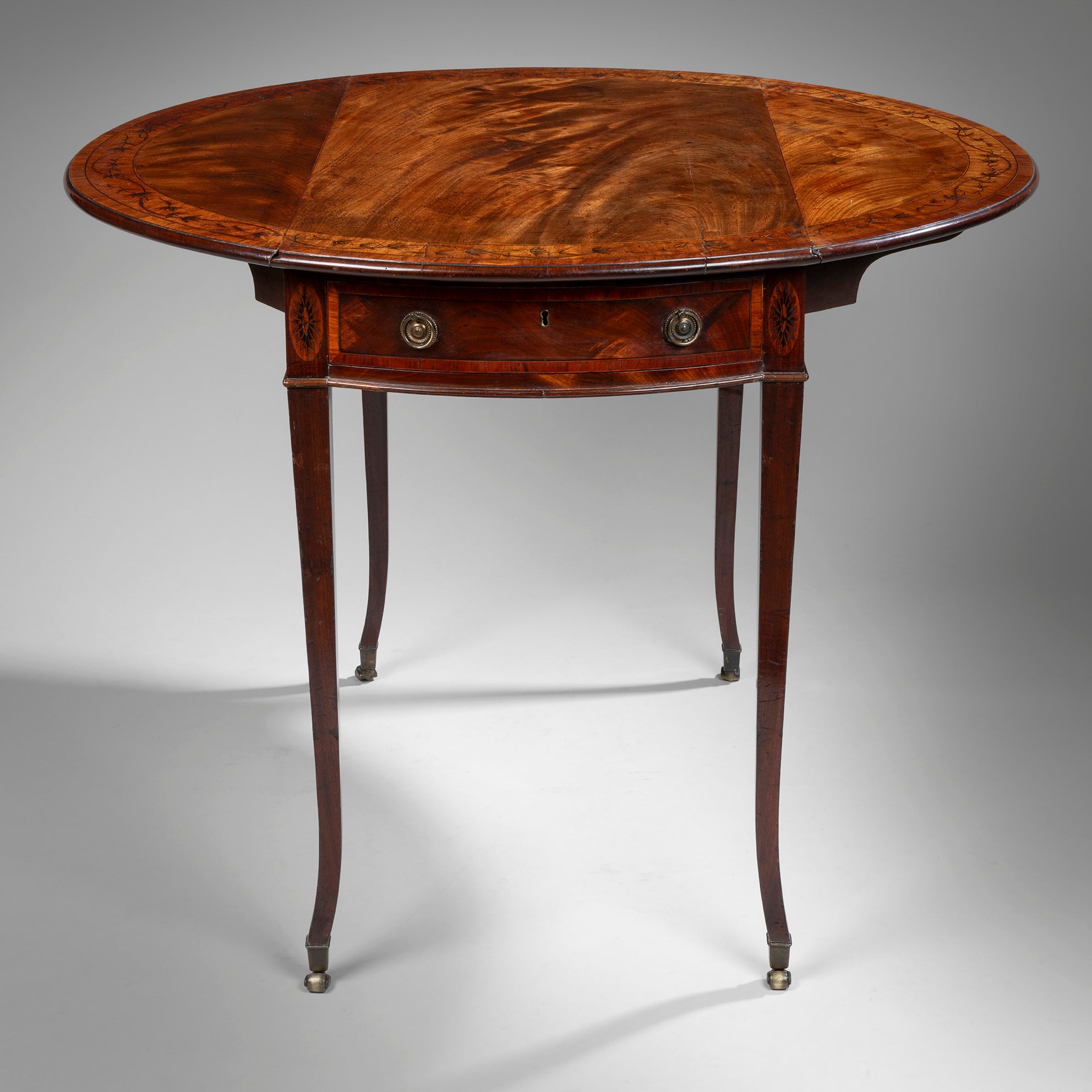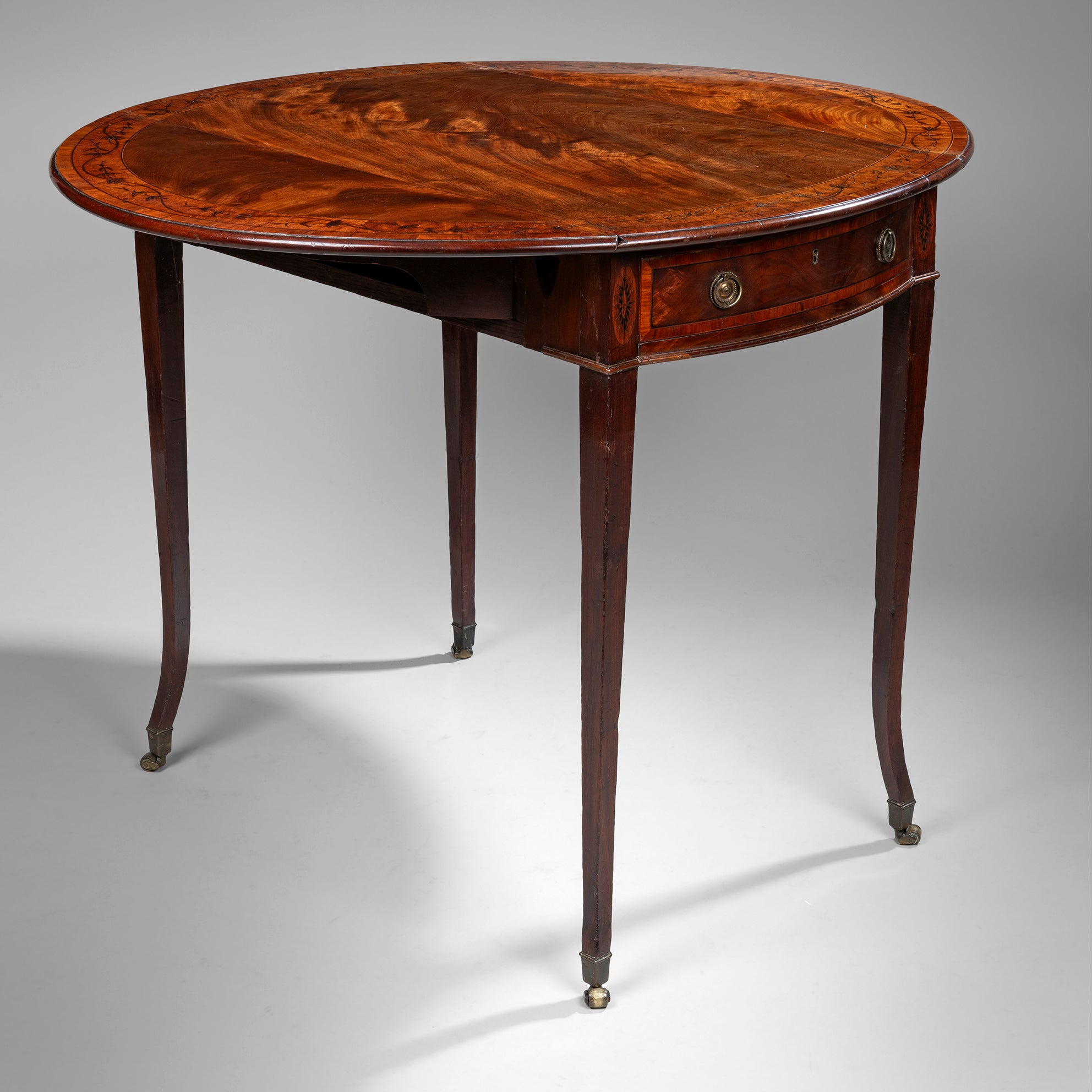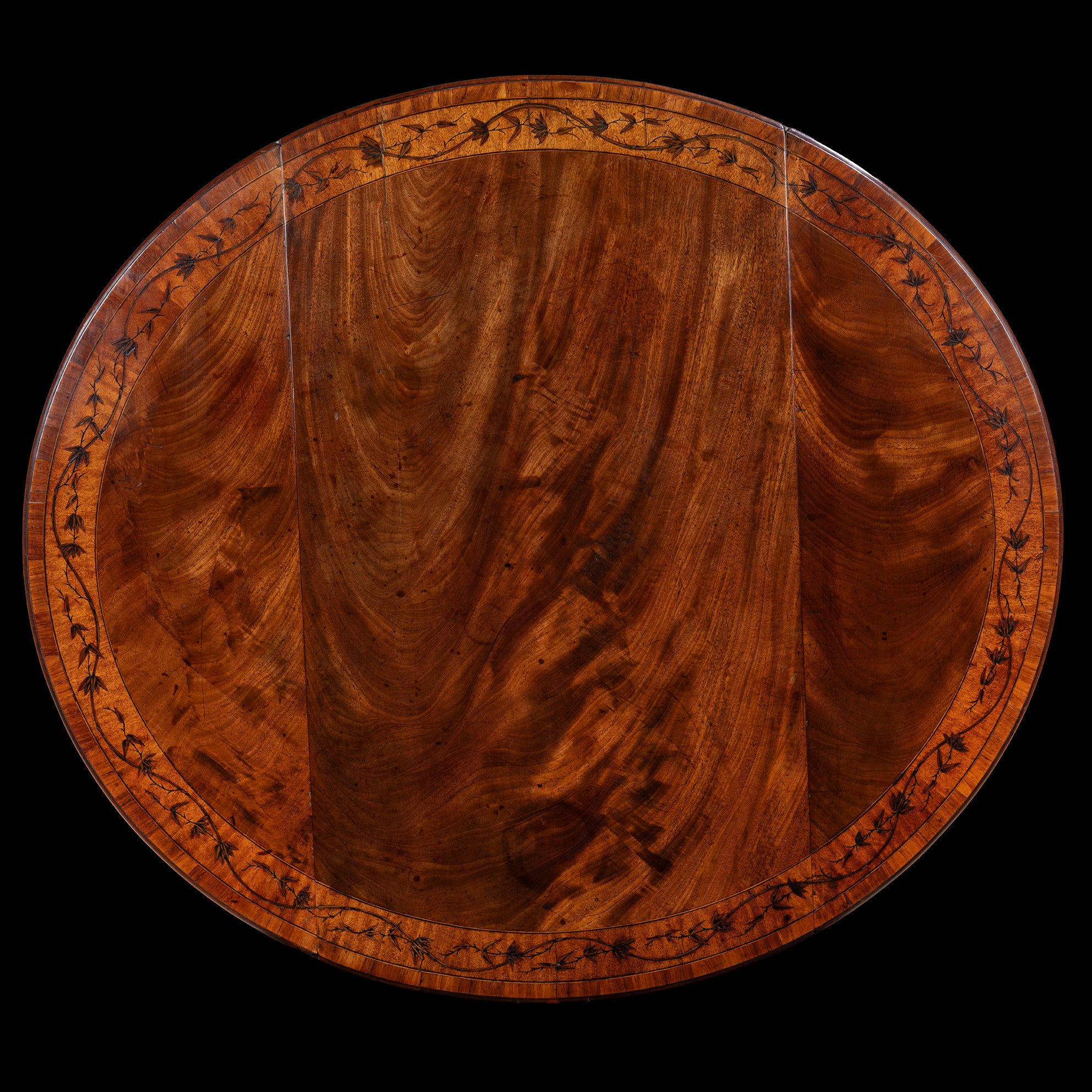 An elegant George III Hepplewhite period mahogany oval pembroke table; the top veneered in beautifully figured mahogany and crossbanded in mahogany which is inlaid with floral marquetry; the frieze drawer is flanked by inlaid paterae and the table stands on elegant square tapering legs which elegantly kick out at the bottom.