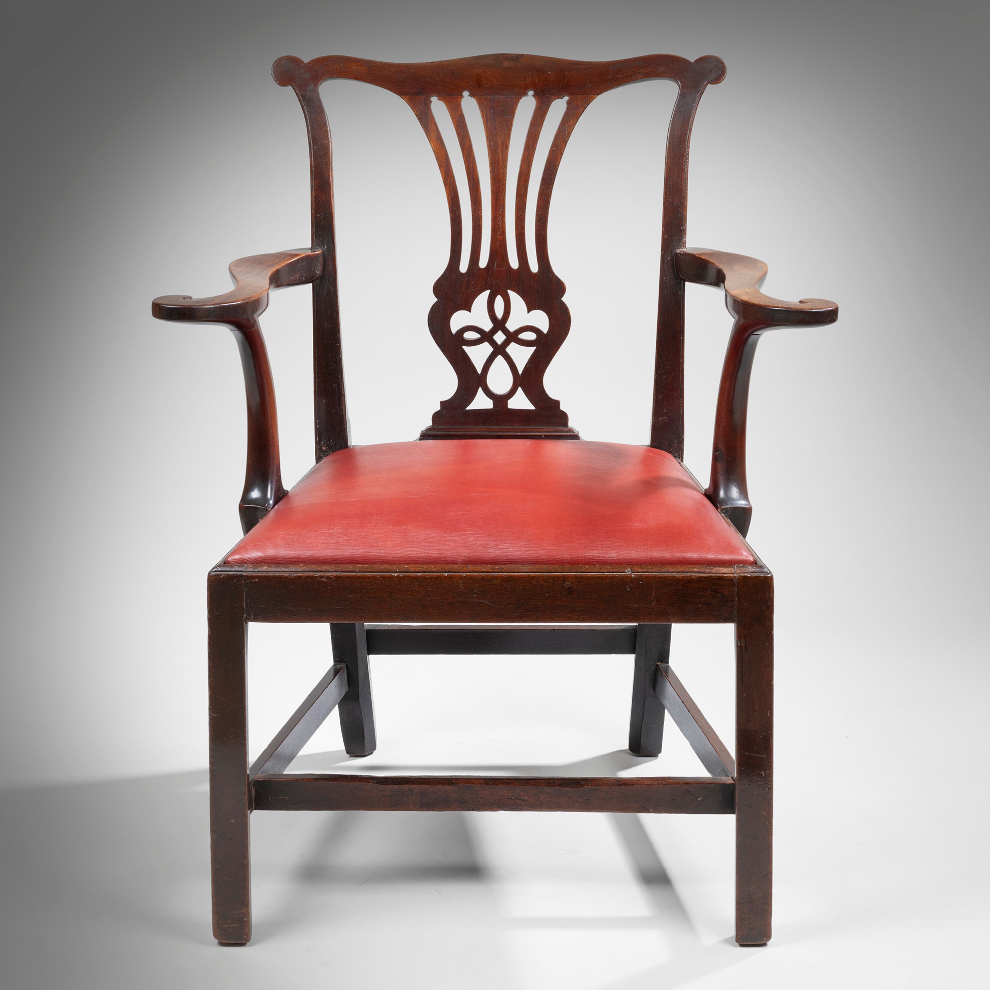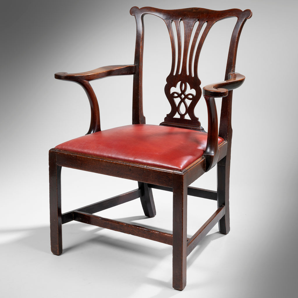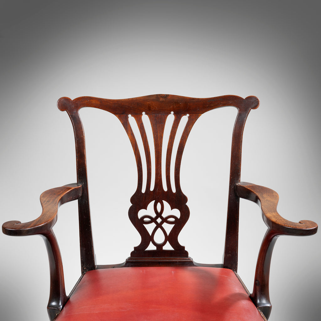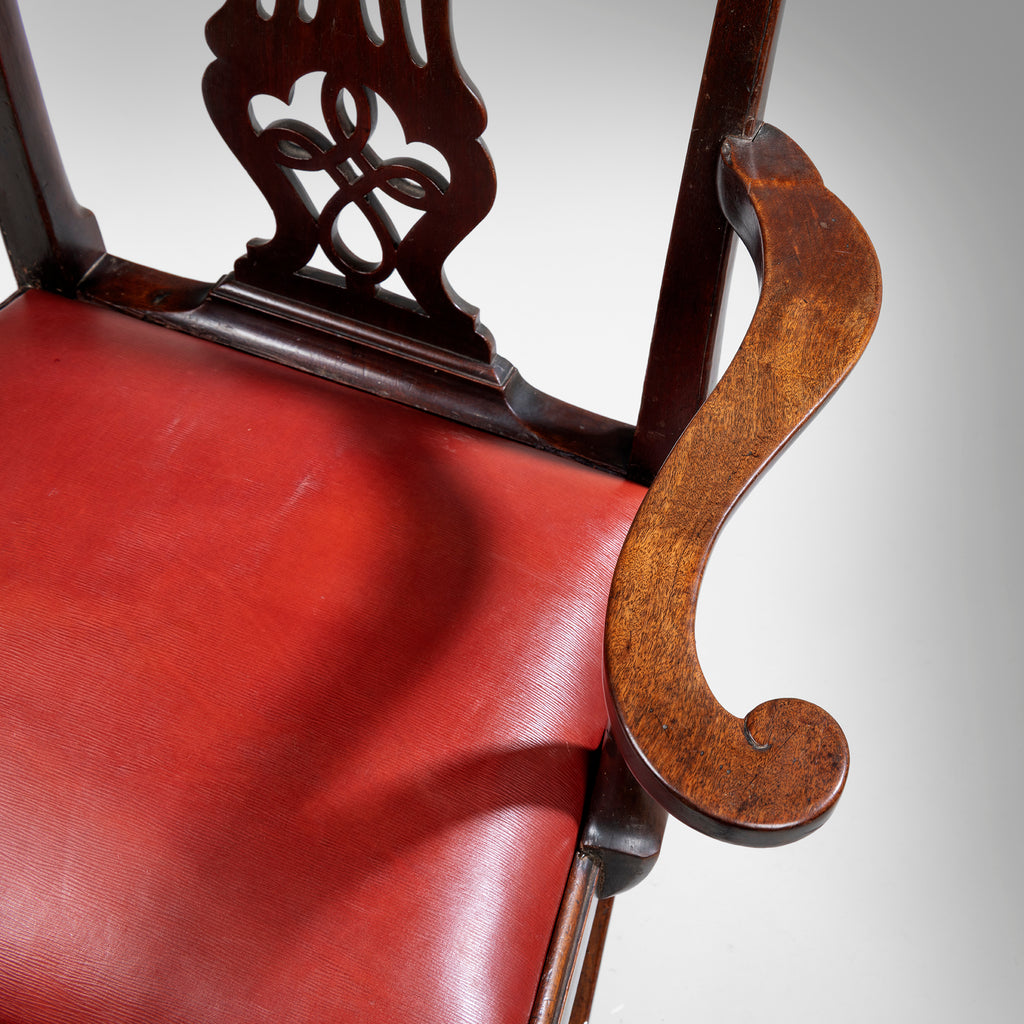 A handsome pair of George III Chippendale period mahogany armchairs; the scrolling top rail above an elegant pierced splat and a drop-in seat upholstered in red leather; having outscrollign arms and raised on square chamfered legs united by an H-stretcher.