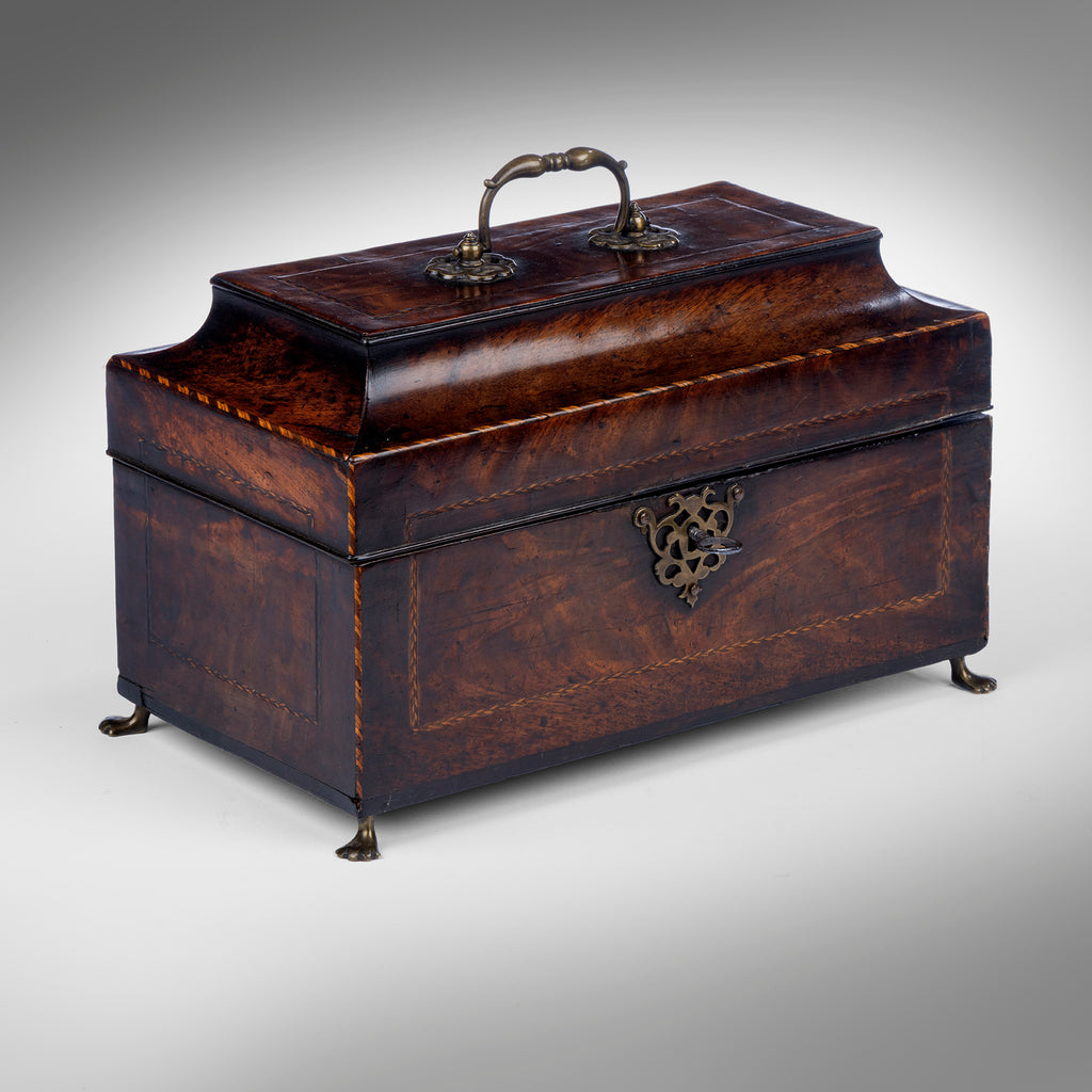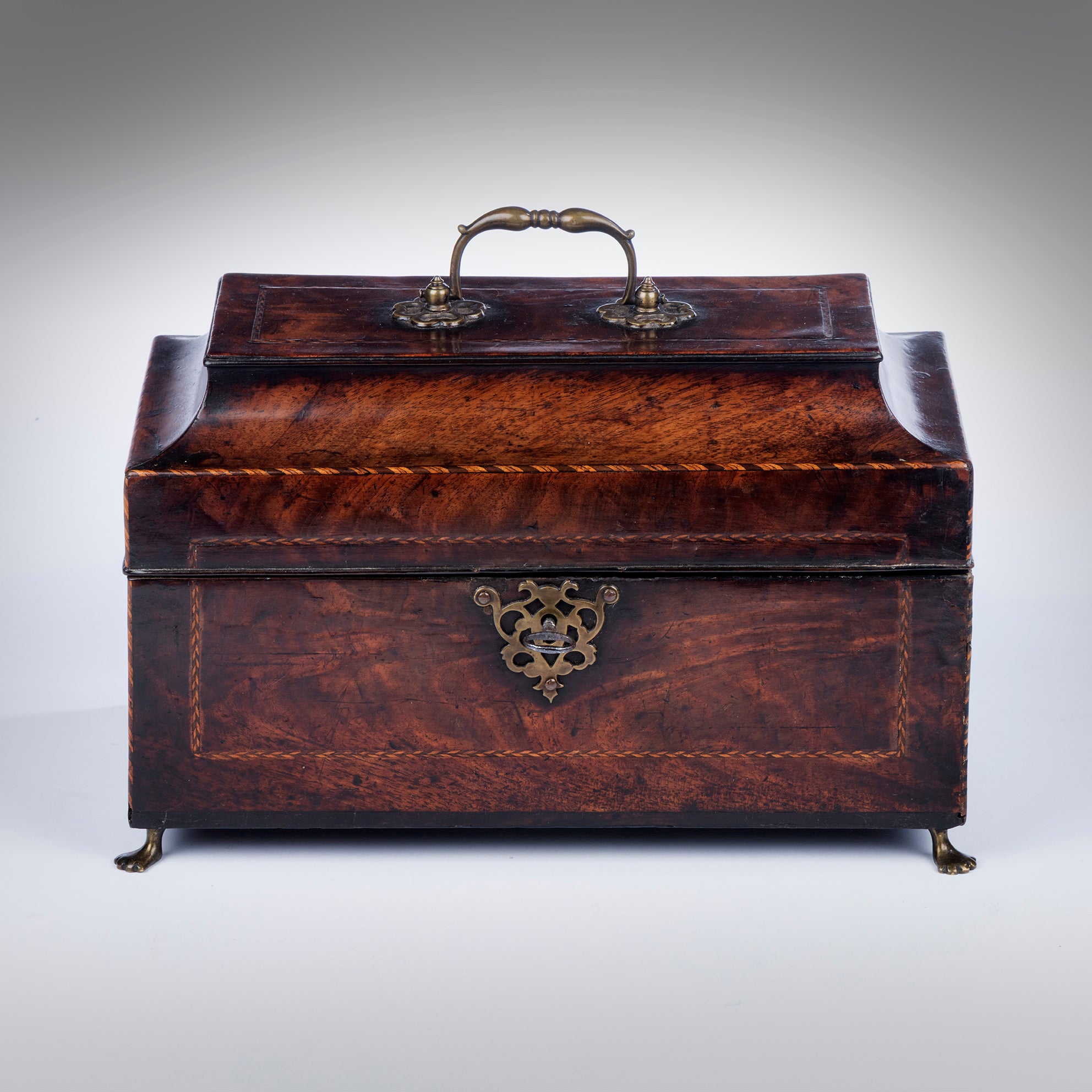 A handsome George III Chippendale period mahogany tea caddy; the cavetto moulded lid veneered in beautifully figured mahogany inlayed with feather banding and retaining its original brass swan neck handle; the sides of the tea caddy are each inlayed with featherbanding and the front retains its original pierced brass escutcheon; raised on the original brass lion paw feet.