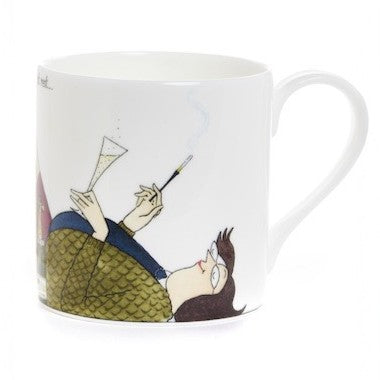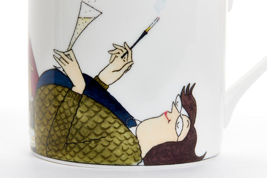 This lovely bone china mug features Daffy Tottering reclining while enjoying a cigarette and a glass of champagne and nonchalantly scratching Slobber, the labrador behind the ear.